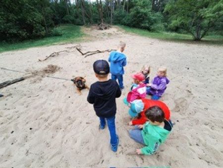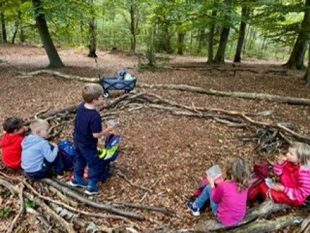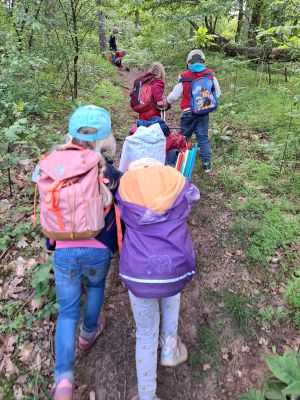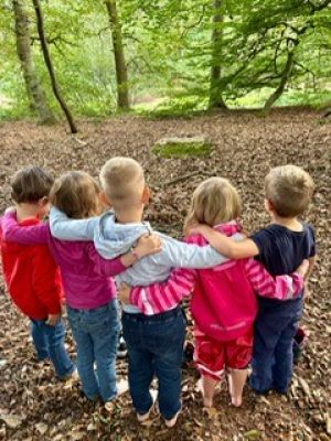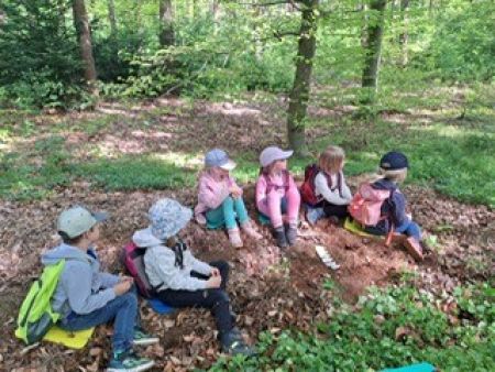 Von April bis September lernten 8 kleine Waldforscher:innen den Aaper Busch in Wesel im Wandel der Jahreszeiten kennen. Tabea Lorenz, zert. Waldpädagogin, zog immer montags mit den 5-und 6-Jährigen mit dem bepackten Bollerwagen in ein neues Abenteuer. Wie weit springen unsere Waldtiere – wie weit schaffe ich? Wieviele Kinder benötigen wir, um unseren Begrüßungsbaum zu umarmen? Die kleinen Naturliebhaber:innen lernten viel über Raupen, Schmetterlinge, Käfer und beobachteten Tag- und Nachtfalter. Sie bauten ein Waldtelefon und sammelten gemeinsam Holz, um ein Tipi zu bauen. Aus den unterschiedlichsten Materialien die der Wald zu bieten hat, kreierten die Kinder ihren eigenen Barfuß-Pfad. Zwischendurch kitzelte es schon heftig unter den Füßen! Seiltauziehen, Balancieren und „blinde" Baumbegegnungen machten sehr viel Spaß. Besonders aufregend war die Waldwanderung mit der Suche nach der vergrabenen Schatzkiste. Das Highlight „Klettermax und Schaukelfee" gemeinsam mit Sylke Döringhoff, Naturpädagogin, rundete das tolle Waldprojekt ab. Es wurde gebaut, geklettert und aus Seilen, Karabinern und zahlreichen Knoten Schaukeln gebaut, in denen einfach nur faul gebaumelt wurde.