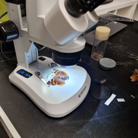 Dazu bringt der Naturpädagoge Stefan Leiding hochwertige Mikroskope der Firma Bresser mit. Zu den gesammelten Naturmaterialien kommen auch stets Exponate dazu. Spannend zu sehen ist, wie ein Libellen, - oder Schmetterlingsflügel aufgebaut ist, oder wie Beeren und Pilze von innen aussehen.