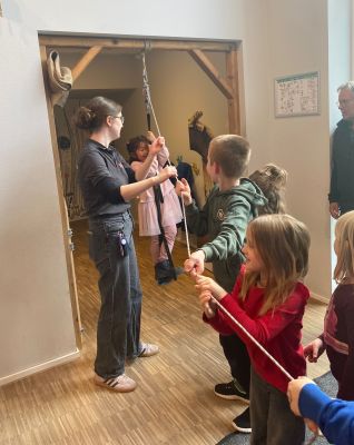Ein weiteres Highlight war die Einlagerung der „Mehlsäcke" mithilfe eines Seilzugs. Jedes Kind durfte sich dabei sogar selbst ein Stück nach oben ziehen lassen – ein großer Spaß für alle Beteiligten!