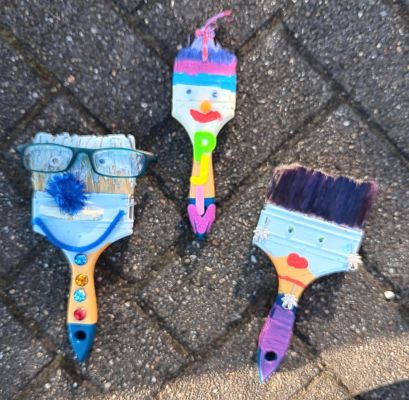 Aus aussortierten Pinseln entstanden im Laufe des Vormittags zauberhafte und überraschend vielseitige Figuren: bunte Zauberwesen, schelmische Monster, geheimnisvolle Waldgeister und sogar ein paar glitzernde Glücksbringer. Mit Farben, Stoffresten, Draht, Naturmaterialien und viel Vorstellungskraft erweckten die jungen Künstler ihre Pinsel zu neuem Leben.